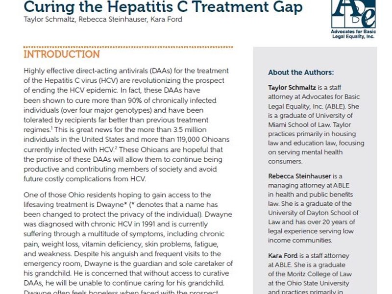 People who suffered from chronic Hepatitis C were finally able to obtain curative treatment covered in 2018 after ABLE attorneys pressed for changes in the levels at which Medicaid would cover the treatment. ABLE attorneys testified before agency committees, met with legislators, and engaged in other advocacy that tipped the scale so that the Ohio Department of Medicaid policies now allow treatment earlier. Hepatitis C medications can cure over 90% of chronically infected individuals, saving lives and allowing people to return to work and care for their families. Effective January 1, 2019, the fibrosis score requirements for Medicaid approval of direct-acting antivirals (DAAs) decreased to 0 so that treatment can begin before damage occurs to organs. “Curing the Hepatitis Treatment Gap,” written by ABLE attorneys Taylor Burns, Rebecca Steinhauser, and Kara Ford, explains why Medicaid coverage for curative treatment at earlier stages of disease is vital and saves pain and hardship, and ultimately, Medicaid dollars. To review the White Paper please click here (pdf).